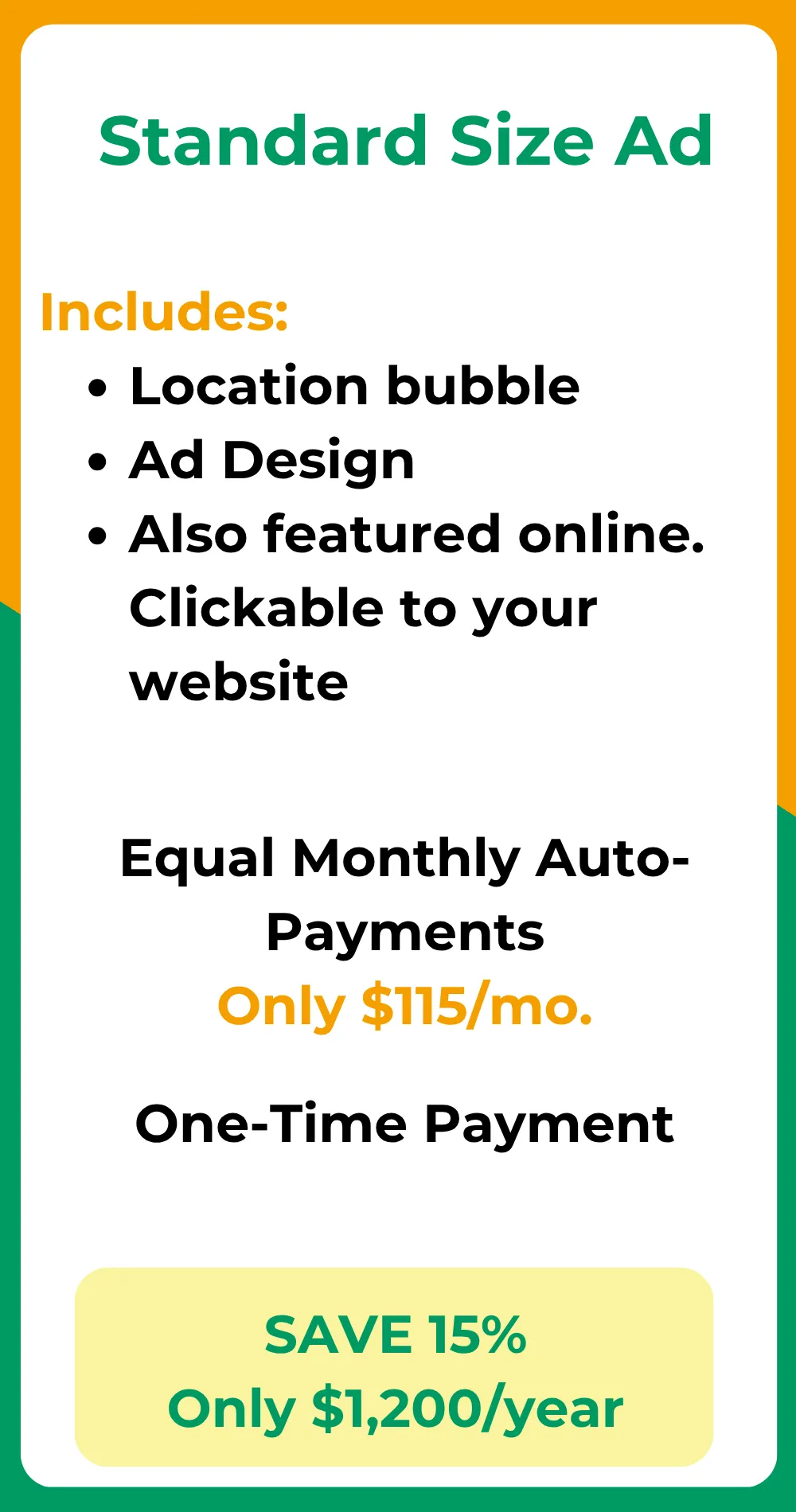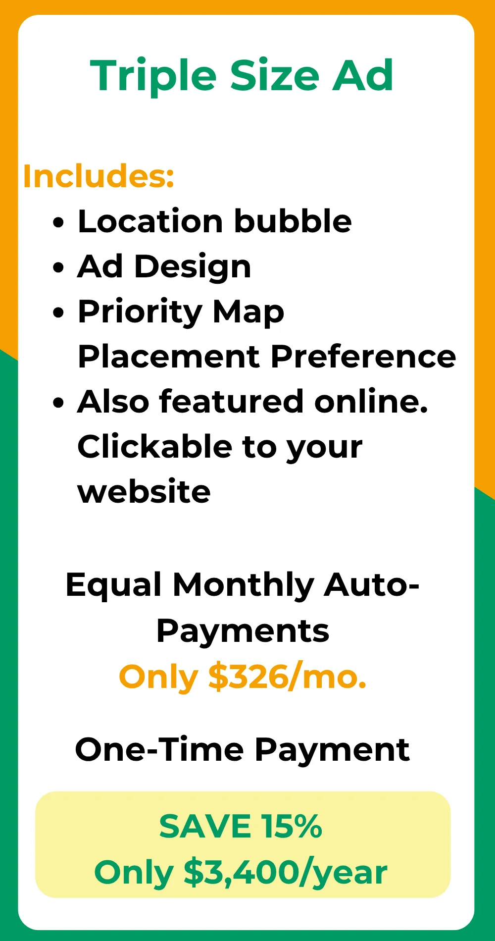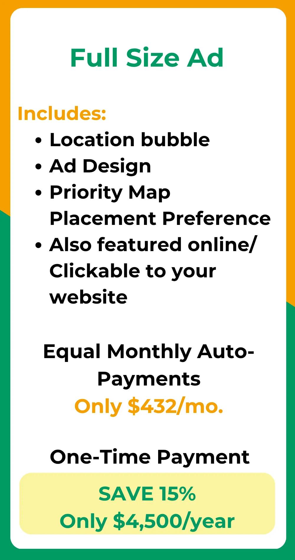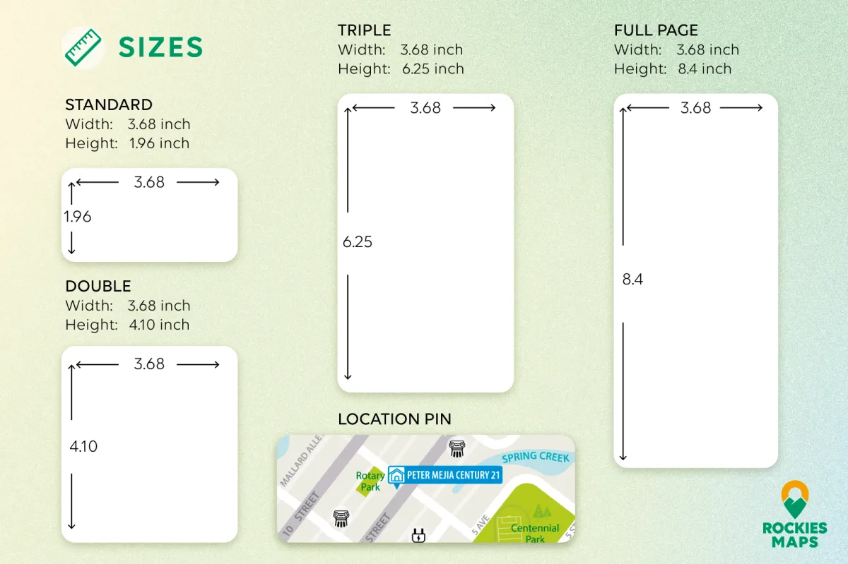 Ready to get your business noticed? Below, you’ll find all the details on what’s included, ad sizes, and pricing options. Spots are limited, so don’t wait—secure your place on the map today!